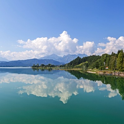 Forggensee is a lake located in the Ostallgäu district of Bavaria, spreading out below the famous Alpine fairytale castles of Hohenschwangau and "Sleeping Beauty" Neuschwanstein, built by "Mad" King Ludwig II.